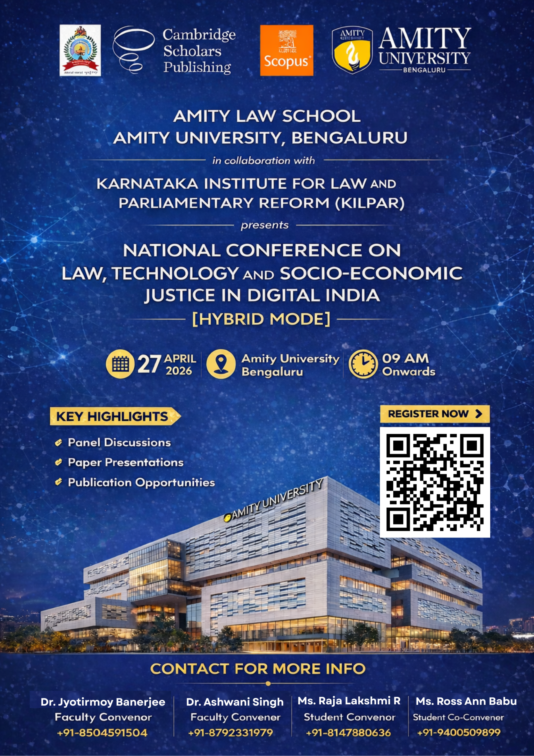 The National Conference on Law, Technology and Socio-Economic Justice in Digital India, organized by Amity Law School, Amity University Bengaluru in collaboration with the Karnataka Institute for Law and Parliamentary Reform (KILPAR), is conceived as a dynamic academic platform aimed at critically examining the transformative interface between law, technology, and socio-economic justice in contemporary India.
