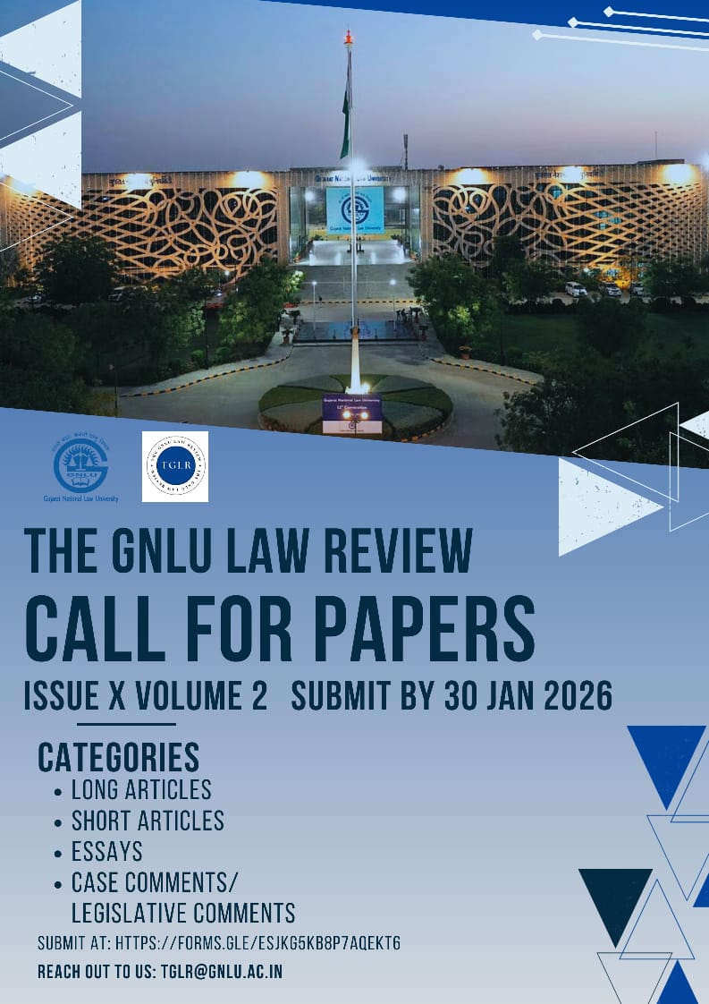 Established in 2008 as the flagship journal of Gujarat National Law University, The GNLU Law Review (ISSN 0974-9810) is a bi-annual, peer-reviewed journal promoting contemporary legal research. Indexed on SCC Online, HeinOnline, and Manupatra, it provides a platform for academicians, practitioners, researchers, and students to share innovative scholarship. TGLR welcomes original articles, case comments, and book reviews addressing emerging legal issues in India and worldwide.