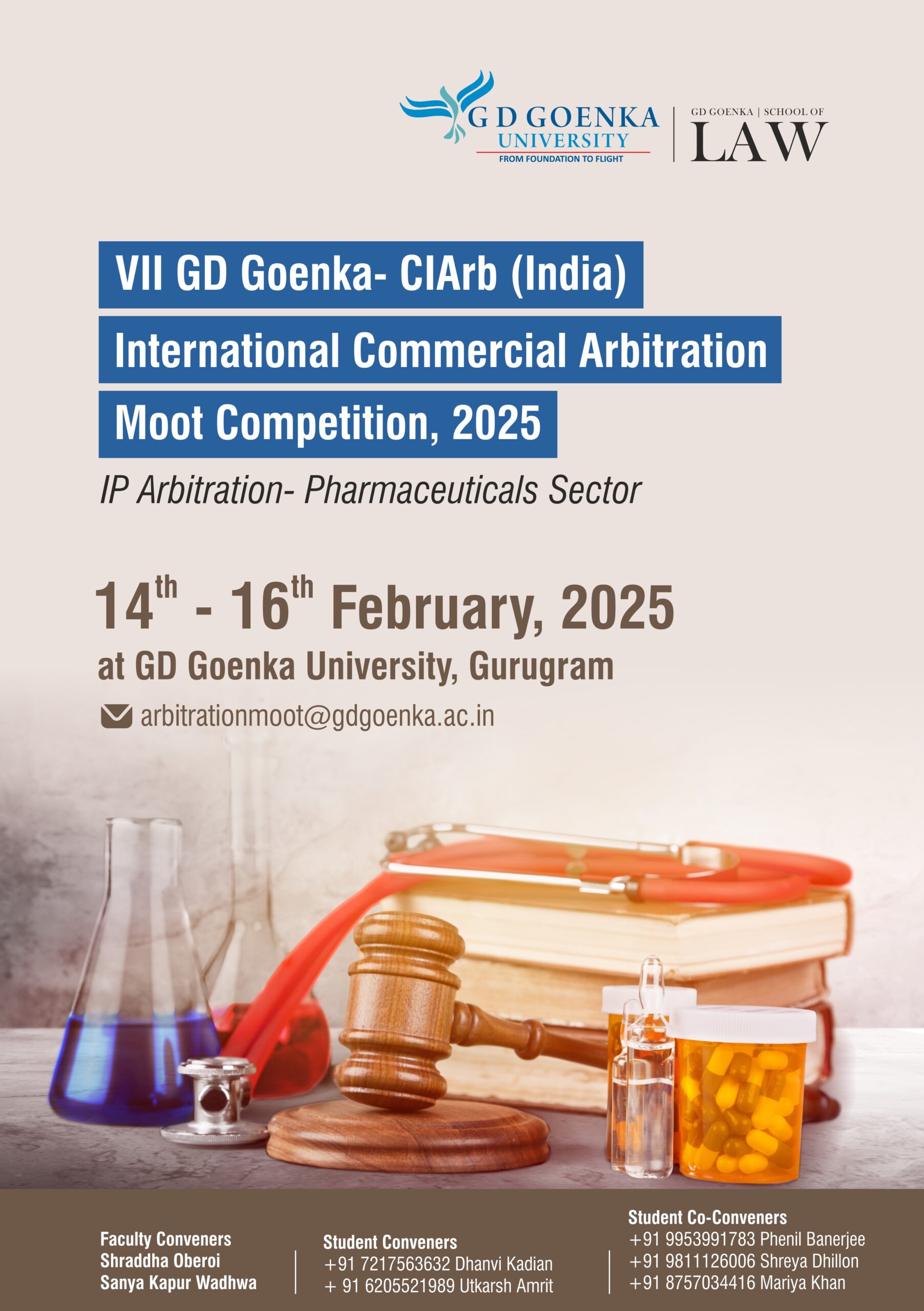 - Students duly enrolled and pursuing a full time 5 years or 3 years undergraduate law course from India or a foreign University with law as a major may apply to participate in the GD Goenka CiArb (India) International Commercial Arbitration Moot Competition, 2025.