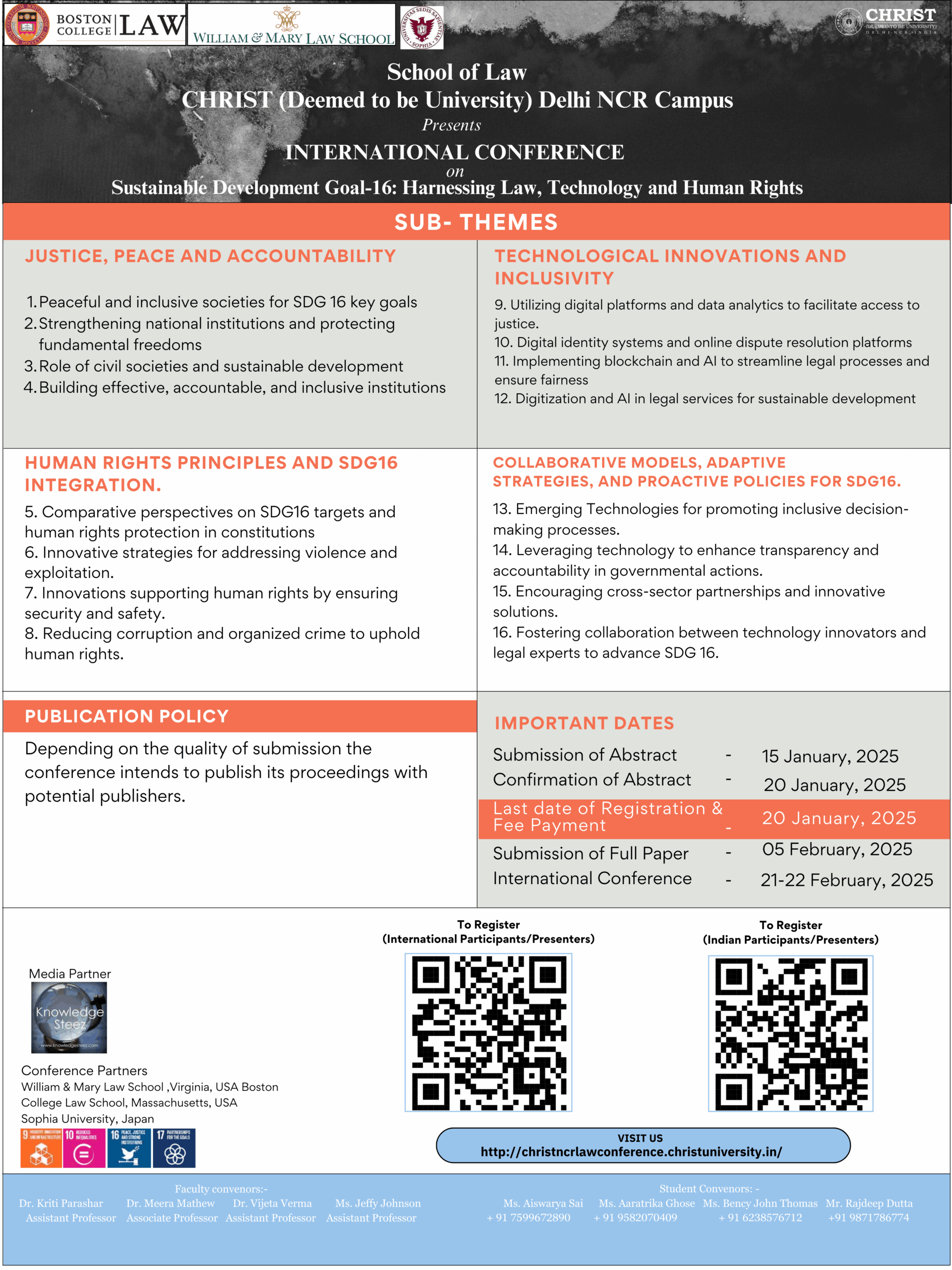 The conference aims to harness the synergetic study of human rights, technology and law with SDG16 in order to make the present ‘decade of action’ truly instrumental in achieving the goals of peace, justice and inclusivity for all. Integrating these areas necessitates strategic frameworks that encourage cross-sector partnerships and innovative solutions. Collaboration between tech innovators and legal experts can drive initiatives like legal tech startups that simplify legal procedures or digital platforms that enhance public participation in governance. Regulatory frameworks must evolve to accommodate technological advancements while upholding principles of fairness and equity. By integrating technology, human rights, and law, societies can advance towards achieving SDG 16, fostering peace, justice, and strong institutions worldwide.
