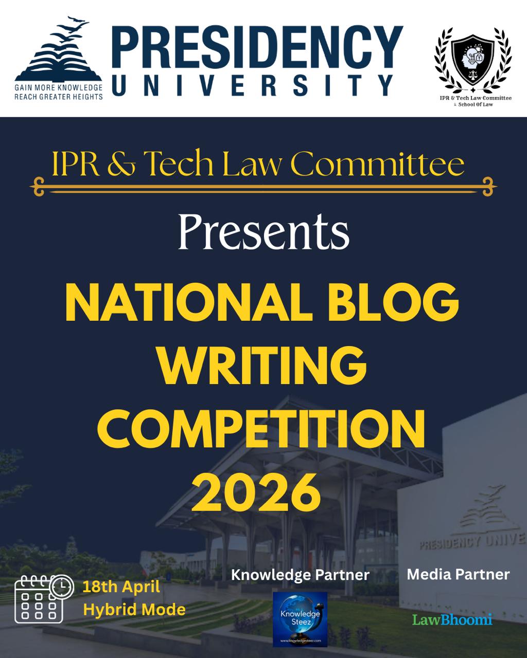 The IPR and Tech Law Committee of Presidency School of Law is pleased to announce the National Blog Writing Competition, a one-day hybrid event aimed at fostering thoughtful discourse at the crossroads of intellectual property and technology law. The competition is open to all undergraduate and postgraduate law students. The event will feature two main segments: