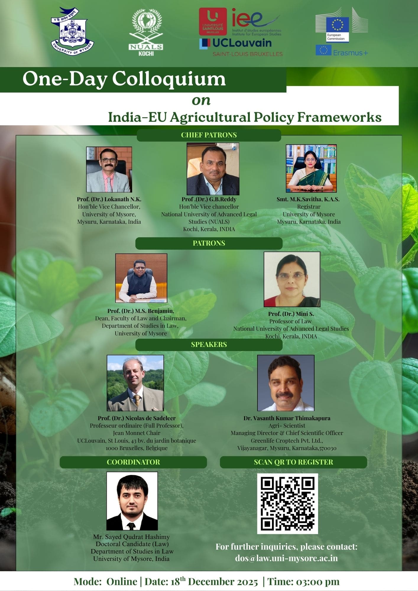 Agriculture remains a foundational pillar of economic development, food security, and rural livelihoods in both India and the European Union (EU). Despite differing socio-economic conditions, institutional arrangements, and market structures, both jurisdictions face common challenges involving sustainability, climate resilience, subsidy reforms, market access, and the protection of small and marginal farmers. These shared concerns create fertile ground for comparative analysis and policy dialogue. The One-Day Colloquium on India–EU Agricultural Policy Frameworks aims to provide a focused platform for scholars, policymakers, practitioners, and sectoral experts to engage in a rigorous examination of the legal and regulatory architectures that shape agricultural policy in India and the EU. Central to the colloquium is an exploration of the contrasting yet intersecting policy orientations: India’s emphasis on food security, minimum support prices, and farmer welfare schemes, versus the EU’s Common Agricultural Policy (CAP), characterised by direct payments, environmental conditionalities, and market-oriented reforms. Beyond policy comparison, the event encourages interdisciplinary reflection on legal safeguards, institutional accountability, and the socio-economic consequences of reform. Particular attention will be given to the implications of subsidy disciplines, tariff measures, environmental norms, and global value chains on smallholder economies. The colloquium provides space for participants to identify gaps in existing frameworks and propose informed pathways for balanced, inclusive, and sustainable agricultural governance. Ultimately, the One-Day Colloquium on India–EU Agricultural Policy Frameworks seeks to stimulate academically grounded and policy-relevant dialogue aimed at deepening mutual understanding and contributing to evidence-based reform. By fostering cross-regional insights, the event aspires to support more equitable, transparent, and resilient agricultural systems in both India and the European Union.